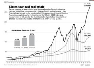In the last 40 years, if you had invested $10,000 into the stock market, it would have grown to $277,000, compared to US homes that would have grown to $58,000.