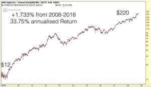 Today, Apple is selling at $220 per share. That results in 1700% returns in 10 years! Equivalent to 33.75%p.a compounded.